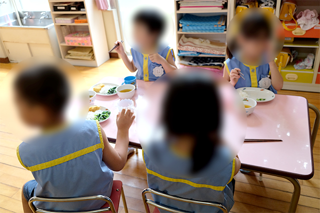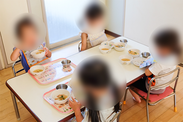 医師の指示のもと、園と保護者で相談して原則、原因食材を除去し対応致します。場合によってはお弁当を持参していただくこともあります。